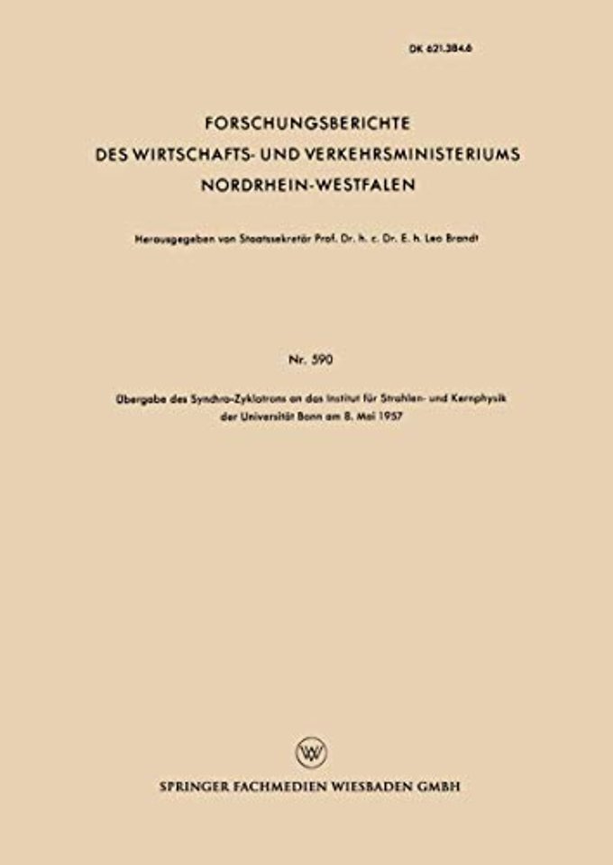 Begrüßungsansprache des Rektors der Universität Bonn, Sr. Magnifizenz Prof. Dr. SCHÄFER.- Begrüßungsansprache des Vorsitzenden der Gesellschaft zur Förderung der kernphysikalischen Forschung e.V., Staatssekretär Prof. Dr. med. h.c. BRANDT.- Vortrag Prof. Dr. RIEZLER zur Fertigung des Synchro-Zyklotrons.- Vortrag Professor GROTH Isotopentrennung nach dem Gaszentrifugenverfahren.- Übergabe des Synchro-Zyklotrons an die Universität Bonn durch den Ministerpräsidenten des Landes Nordrhein-Westfalen Fritz STEINHOFF.- Dankrede Sr. Magnifizenz Prof. Dr. SCHÄFER.- Dankworte Prof. Dr. RIEZLER nach der Übergabe des Synchro-Zyklotrons durch den Rektor.
