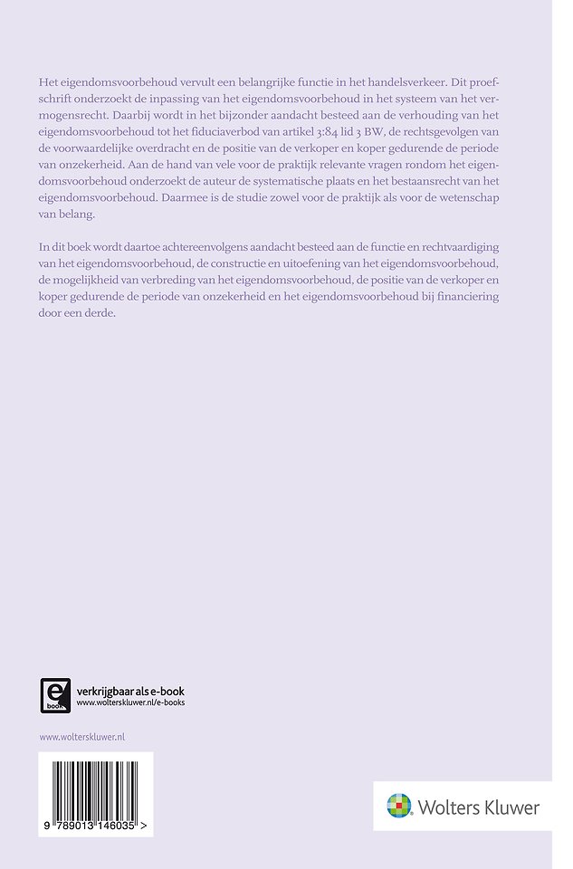 Bijzondere aandacht bestaat daarbij voor de verhouding van het eigendomsvoorbehoud tot het fiduciaverbod van artikel 3:84 lid 3 BW. Dit proefschrift biedt verdieping aan wetenschappers en praktijkjuristen die geregeld te maken hebben met het eigendomsvoorbehoud. Maar ook daarbuiten is het een aanrader, omdat het eigendomsvoorbehoud raakt aan allerlei algemene goederenrechtelijke leerstukken.