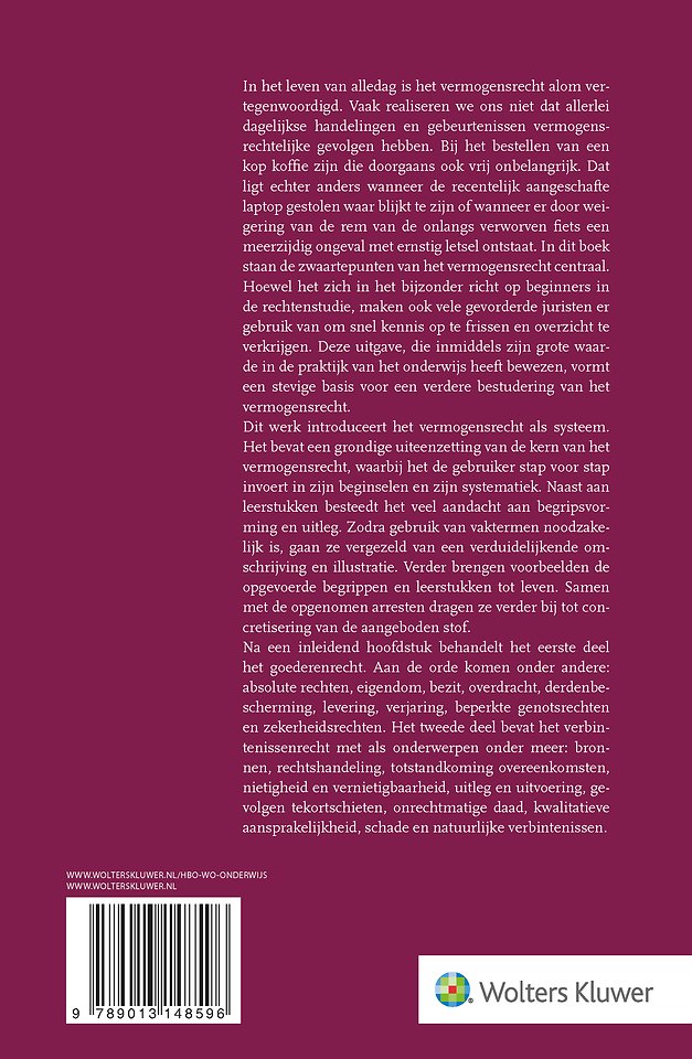 Kwesties omtrent het vermogensrecht doen zich in het dagelijks leven volop voor. Deze titel bevat een grondige uiteenzetting van de kern van het vermogensrecht. De uitgave richt zich primair op beginners in de rechtenstudie. Gevorderde juristen gebruiken haar om hun kennis op te frissen.
