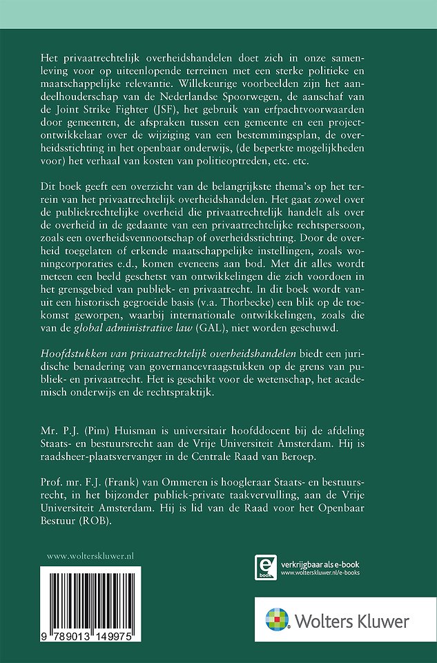 Deze titel bevat een actueel en compleet overzicht van de belangrijkste thema’s op het terrein van het privaatrechtelijk overheidshandelen en de semipublieke instellingen. De uitgave neemt een uniek perspectief in door publiek- en privaatrecht vanuit een governancebenadering te bezien.