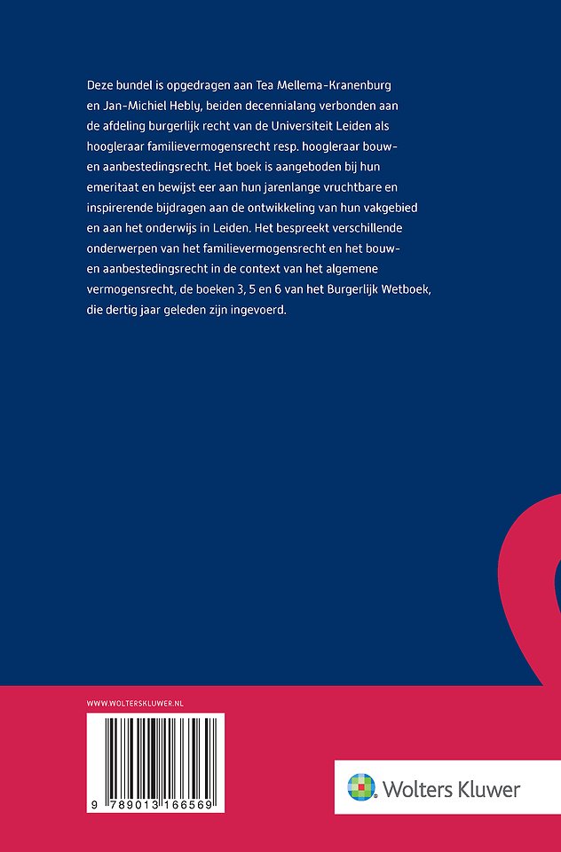 Deze bundel is opgedragen aan hoogleraar familievermogensrecht Tea Mellema-Kranenburg en hoogleraar bouw- en aanbestedingsrecht Jan-Michiel Hebly. Er is geen andere uitgave waarin twee zo uiteenlopende rechtsgebieden worden behandeld in één bundel, op een wijze die voor verschillende specialisten interessant is.