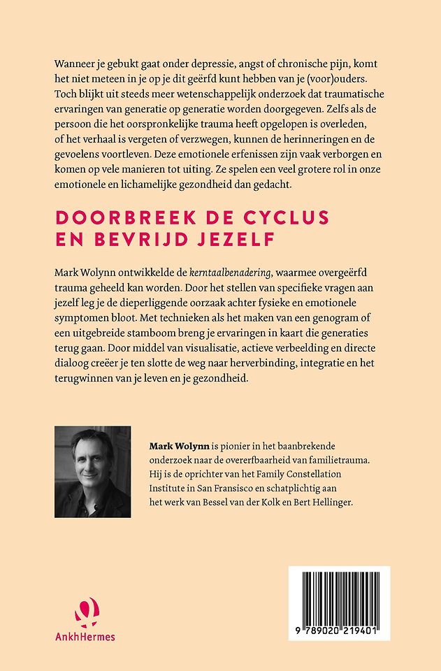 Als pionier op het gebied van erfelijk familietrauma, werkte Mark Wolynn meer dan twintig jaar als therapeut met individuen en groepen. In dit boek vertaalt hij deze kennis naar zeer toegankelijke informatie. Je gaat aan de slag met je familiestamboom, zelftests, oefeningen in visualisatie, actieve verbeelding en directe dialoog om je oude pijnstukken opnieuw te integreren en je leven en gezondheid terug te winnen.