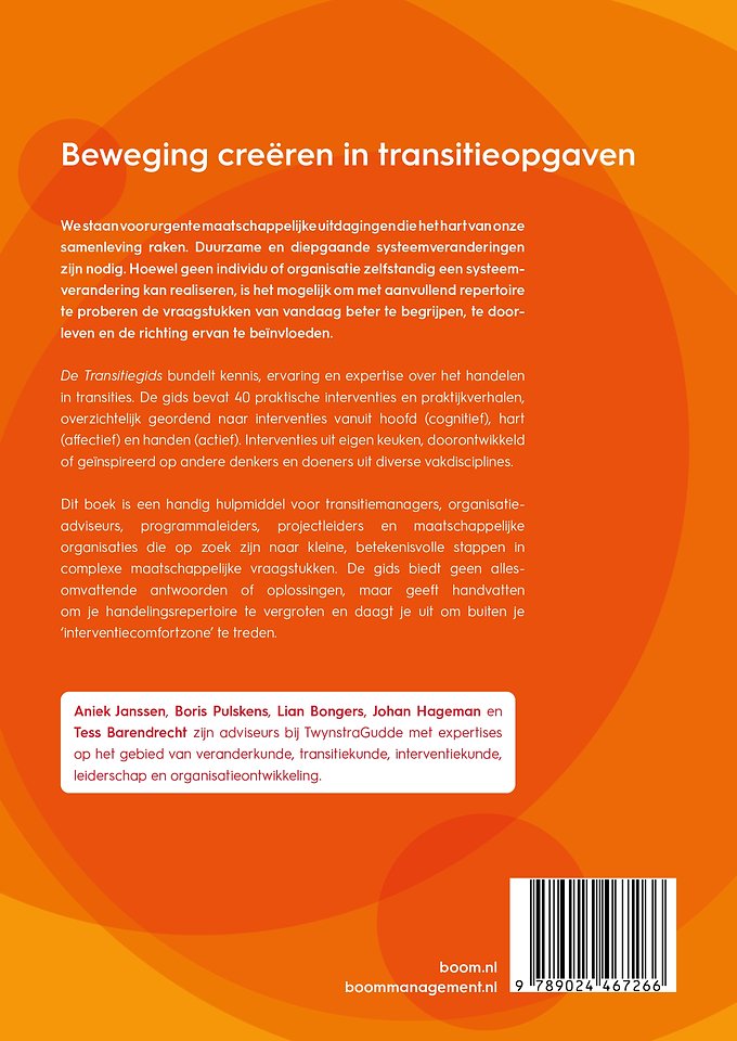 In De Transitiegids bundelen vijf ervaren adviseurs hun eigen kennis en ervaring over het handelen in transities en de expertise van een groot aantal vakgenoten. Ze bieden tientallen praktische interventies en diverse praktijkverhalen die je helpen om met kleine, impactvolle stappen beweging te creëren in transities. Het boek dient als inspiratiebron, naslagwerk en handzame gids, overzichtelijk geordend naar doel, fase van de transitie, werkingsprincipe en niveau van interveniëren.