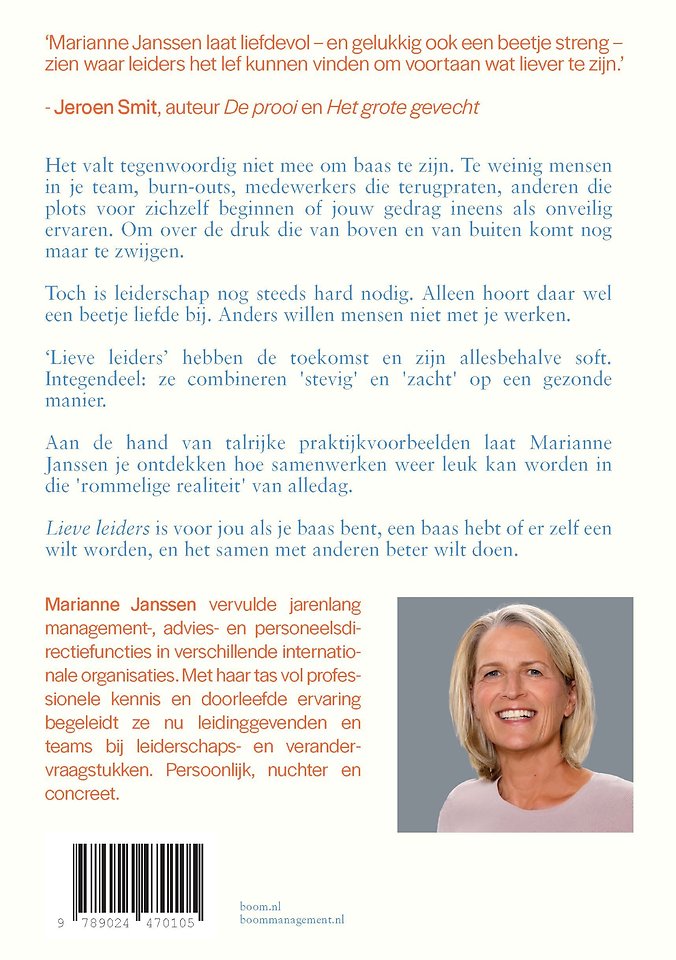 Marianne Janssen laat liefdevol – en gelukkig ook een beetje streng – zien waar leiders het lef kunnen vinden om voortaan wat liever te zijn. - Jeroen Smit, auteur De prooi en Het grote gevecht