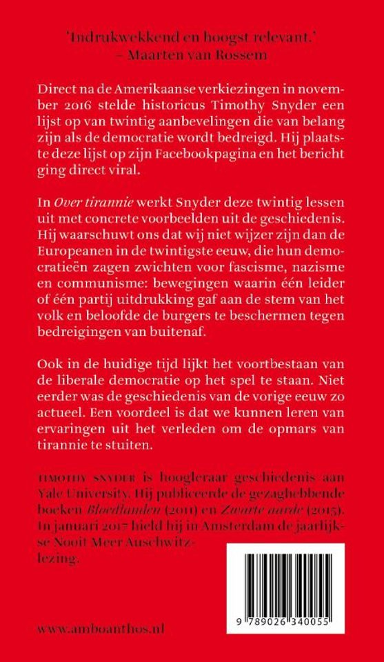 In Over tirannie werkt Snyder deze twintig lessen uit met concrete voorbeelden uit de geschiedenis. Hij waarschuwt ons dat wij niet wijzer zijn dan de Europeanen in de twintigste eeuw, die hun democratieën zagen zwichten voor fascisme, nazisme en communisme: bewegingen waarin één leider of één partij uitdrukking gaf aan de stem van het volk en beloofde de burgers te beschermen tegen bedreigingen van buitenaf.
