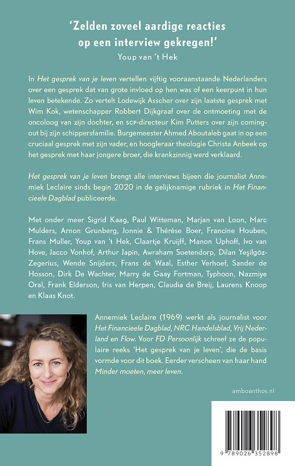 In Het gesprek van je leven van Annemiek Leclaire vertellen vijftig vooraanstaande Nederlanders over het gesprek dat hun leven veranderde, de conversatie die grote invloed op hen had of een keerpunt in hun leven betekende.