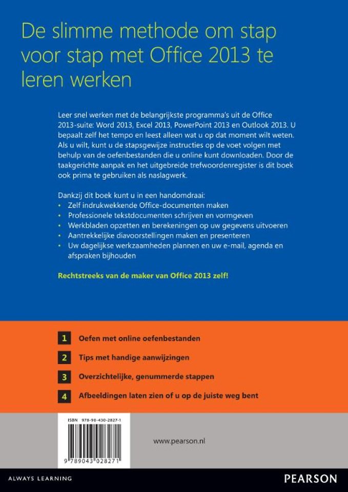 Leer snel werken met de belangrijkste programma's uit de Office 2013-suite: Word 2013, Excel 2013, PowerPoint 2013 en Outlook 2013. U bepaalt zelf het tempo en leest alleen wat u op dat moment wilt weten. Als u wilt, kunt u de stapsgewijze instructies op de voet volgen met behulp van de oefenbestanden die u online kunt downloaden. Door de taakgerichte aanpak en het uitgebreide trefwoordenregister is dit boek ook prima te gebruiken als naslagwerk.