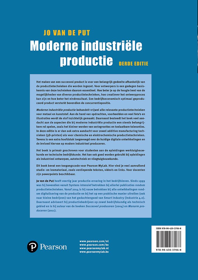 Moderne industriële productie behandelt vrijwel alle relevante productietechnieken voor metaal en kunststof. Aan de hand van opdrachten, voorbeelden en veel foto’s en illustraties wordt de stof inzichtelijk gemaakt. Daarnaast besteedt het boek veel aandacht aan de aspecten die bij moderne industriële productie een steeds belangrijkere rol spelen, zoals het kleiner worden van seriegroottes en toelaatbare toleranties. In deze editie is er dan ook extra aandacht voor zowel Additieve Manufacturing technieken (3D-printen) als voor chemische en elektrochemische productietechnieken. Tevens is een extra hoofdstuk toegevoegd over de huidige digitale ontwikkelingen en de invloed hiervan op modern industrieel produceren.