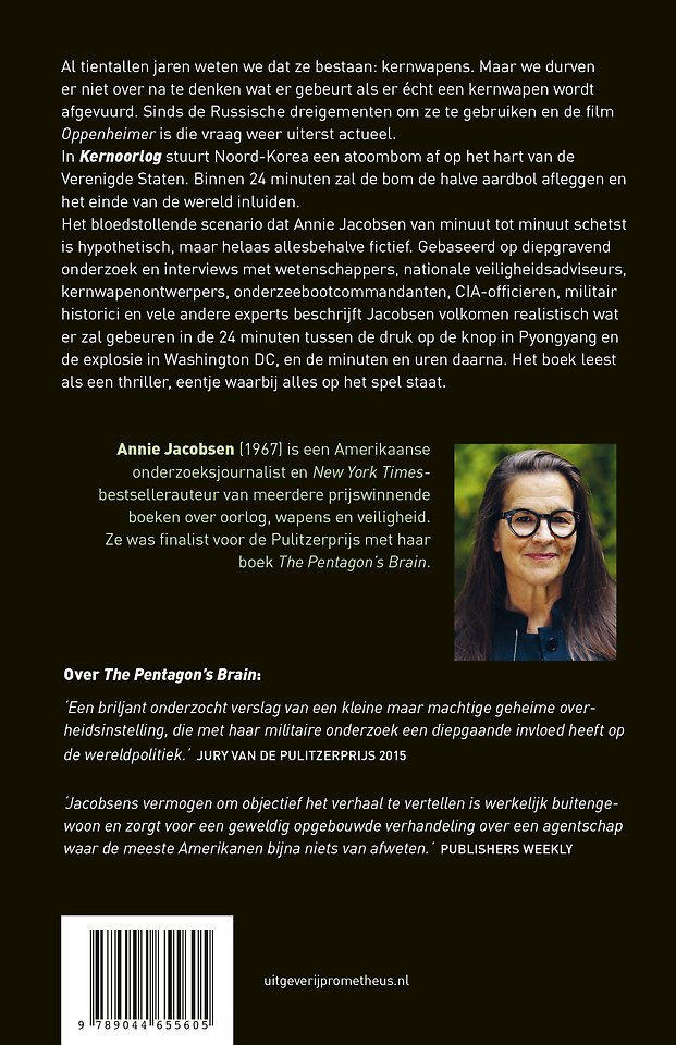 Annie Jacobsen (1967) is een Amerikaanse onderzoeksjournalist en New York Times-bestsellerauteur van meerdere prijswinnende boeken over oorlog, wapens en veiligheid. Ze was finalist voor de Pulitzerprijs met haar boek The Pentagon’s Brain.