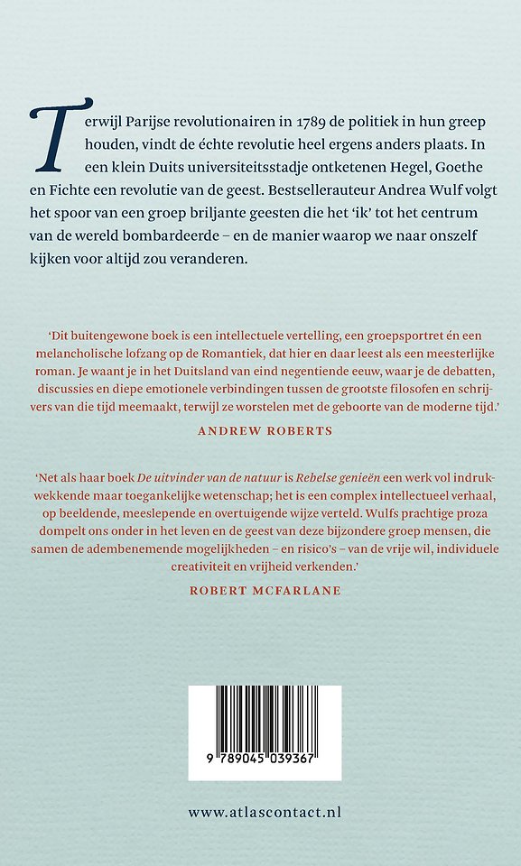 Wulf beschrijft dat de oorsprong van ideeën zoals individualisme, zelfbeschikking en vrijheid ligt in Jena, een klein Duits universiteitsstadje. Daar begon in de laatste jaren van de achttiende eeuw een bont genootschap op een radicaal nieuwe wijze na te denken over het ‘zelf’. Onder hen bevond zich de raadselachtige Caroline Schlegel. Ze filosofeerden over het scheppend vermogen van het zelf, de eenheid van de natuur en de ware aard van vrijheid – en daarmee ontketenden ze de Romantiek, een revolutie van de geest die tot op de dag van vandaag doorwerkt.