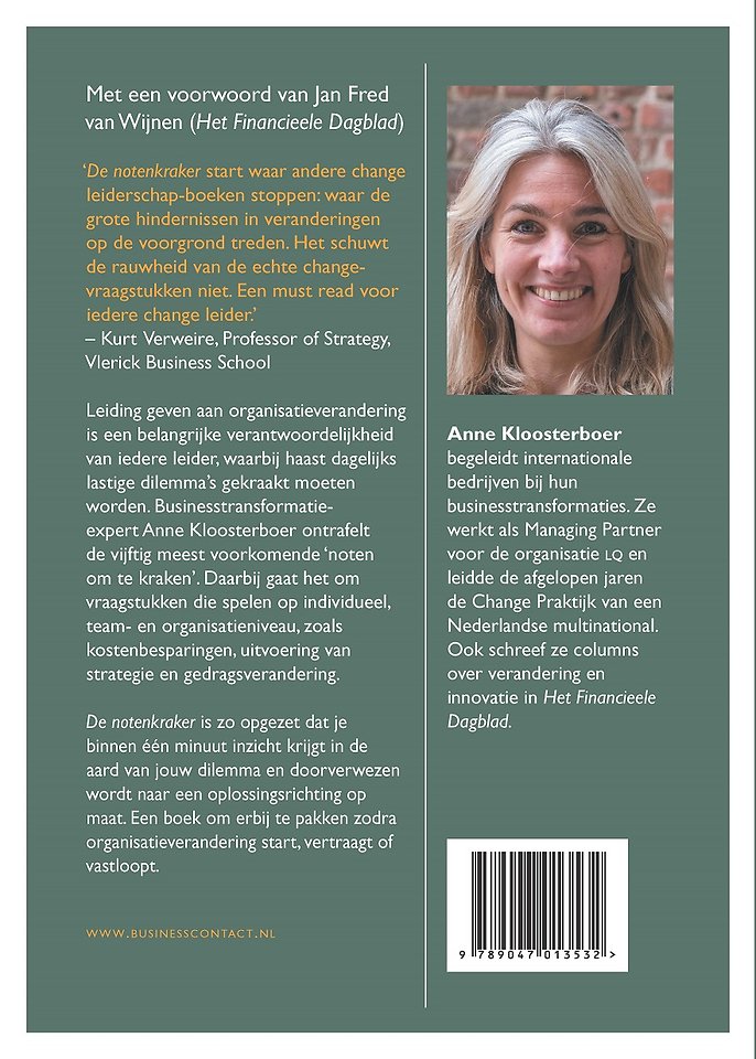 Meer over Anne KloosterboerGoed in staat zijn veranderingen door te voeren is een belangrijke verantwoordelijkheid van iedere leider. Een verantwoordelijkheid die in de dagelijkse praktijk vraagt om het kraken van lastige dilemma’s. De bestaande veranderliteratuur geeft prachtige vergezichten over welke stappen je zou moeten zetten in een verandertraject, maar biedt onvoldoende houvast om de dilemma’s die je gaandeweg tegenkomt op te lossen.