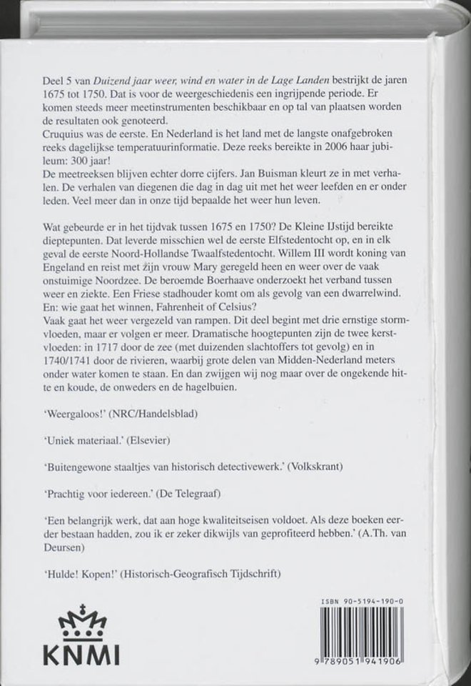 Van het grote werk van Jan Buisman, Duizend jaar weer, wind en water in de Lage Landen, zijn tot nog toe vijf delen verschenen. Het is een geweldig werk, en de periode 1675 tot 1750 was in veel opzichten zeer bewerkelijk. Vooral het feit dat er in deze periode meetapparatuur voor temperatuur en luchtdruk ontstaat maakt dit deel complex. Want de meetreeksen uit het begin van de zogenaamde instrumentele periode zijn vaak moeilijk te interpreteren. De cijfers van mannen als Fahrenheit, Celsius, Eckhardt en Cruquius moeten soms cijfer voor cijfer zorgvuldig omgerekend worden.