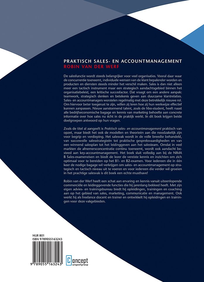 Het boek sluit volledig aan bij de NIMA B Sales-exameneisen en biedt de lezer de vereiste kennis en inzichten om zich optimaal voor te bereiden op het B1- en B2-examen. Voor iedereen die in één keer de nodige bagage wil verkrijgen om sales- en accountmanagement op strategisch en tactisch niveau uit te voeren en voor iedereen die verder wil groeien in het prachtige salesvak is dit boek een echte musthave!