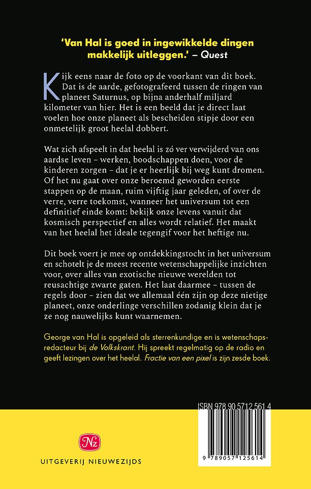 Kijk eens naar de foto op de voorkant van dit boek. Dat is de aarde, gefotografeerd tussen de ringen van planeet Saturnus, op bijna anderhalf miljard kilometer van hier. Het is een beeld dat je direct laat voelen hoe onze planeet als bescheiden stipje door een onmetelijk groot heelal dobbert.