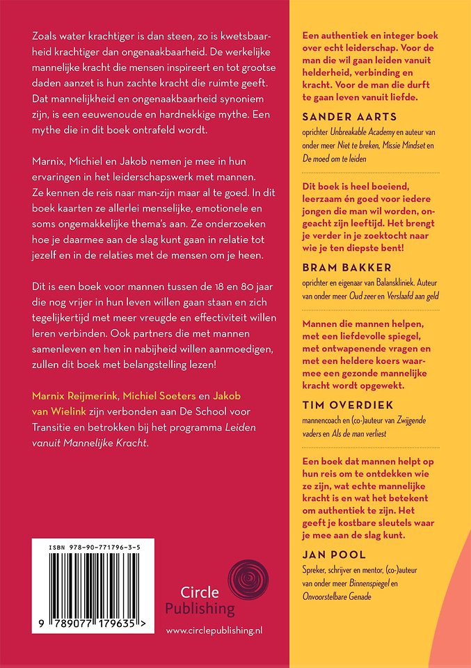 Dit mooie boek geeft je kostbare sleutels waar je mee aan de slag kunt gaan en die je gaan helpen om te leiden vanuit mannelijke kracht! - Jan Pool, spreker, schrijver en mentor, auteur van onder meer 'Binnenspiegel' (met Michiel Santman) en 'Onvoorstelbare Genade'