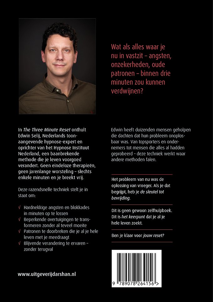 In The Three Minute Reset onthult Edwin Selij, Nederlands toonaangevende hypnose-expert en oprichter van het Hypnose Instituut Nederland, een baanbrekende methode die je leven voorgoed verandert. Geen eindeloze therapieën, geen jarenlange worsteling – slechts enkele minuten en je breekt vrij.