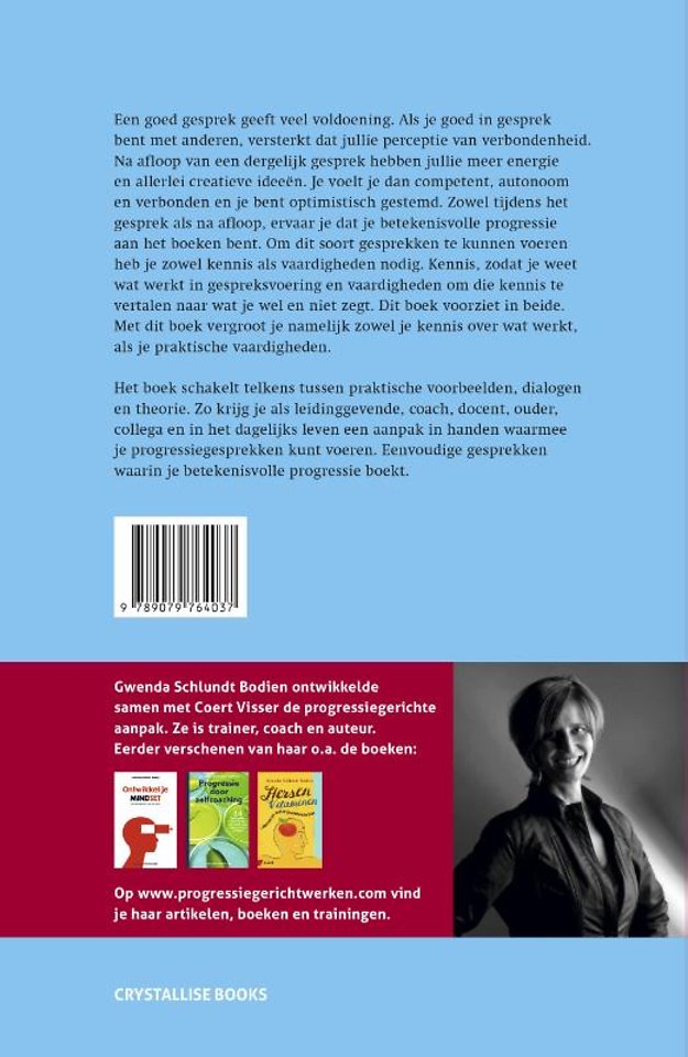 Het boek schakelt telkens tussen praktische voorbeelden, dialogen en theorie. Zo krijg je als leidinggevende, coach, docent, ouder, collega en in het dagelijks leven een aanpak in handen waarmee je progressiegesprekken kunt voeren. Eenvoudige gesprekken waarin je betekenisvolle progressie boekt.