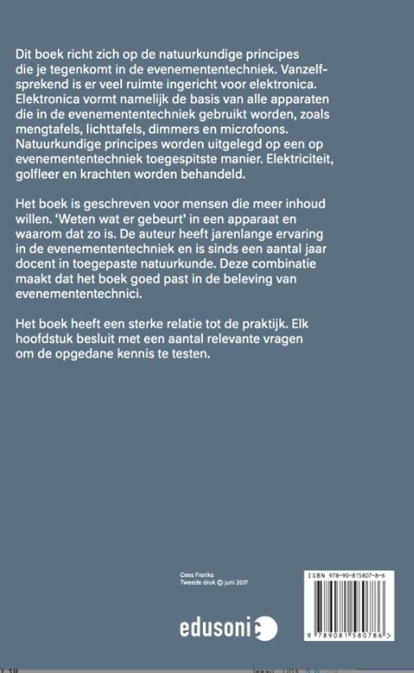 Dit boek richt zich op de gebieden in de natuurkunde die je tegenkomt in de evenemententechniek. Vanzelfsprekend is er veel ruimte ingericht voor electronica. Elektronica vormt namelijk de basis van alle apparaten die in de evenemententechniek gebruikt worden, zoals mengtafels en lichttafels, dimmers en microfoons. Natuurkundige principes worden uitgelegd op een op evenemententechniek toegespitste manier. Elektriciteit, golfleer en krachten komen voorbij. Het boek is geschreven voor mensen die meer inhoud willen. Weten wat er gebeurt in een apparaat en waarom dat zo is. De auteur heeft jarenlange ervaring in de evenemententechniek en is sinds 5 jaar docent in toegepaste natuurkunde. Deze combinatie maakt dat het boek goed past in de beleving van evenemententechnici.Het boek heeft een sterke relatie tot de praktijk. Elk hoofdstuk besluit met een aantal relevante vragen om de opgedane kennis te testen.