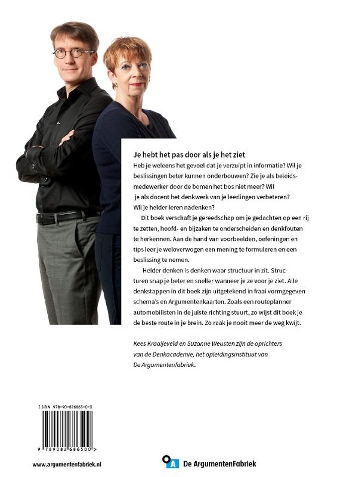 Helder denken is denken waar structuur in zit. Structuren snap je beter en sneller wanneer je ze voor je ziet. Alle denkstappen in dit boek zijn uitgetekend in fraai vormgegeven schema’s en Argumentenkaarten. Zoals een routeplanner automobilisten in de juiste richting stuurt, zo wijst dit boek je de beste route in je brein. Zo raak je nooit meer de weg kwijt.
