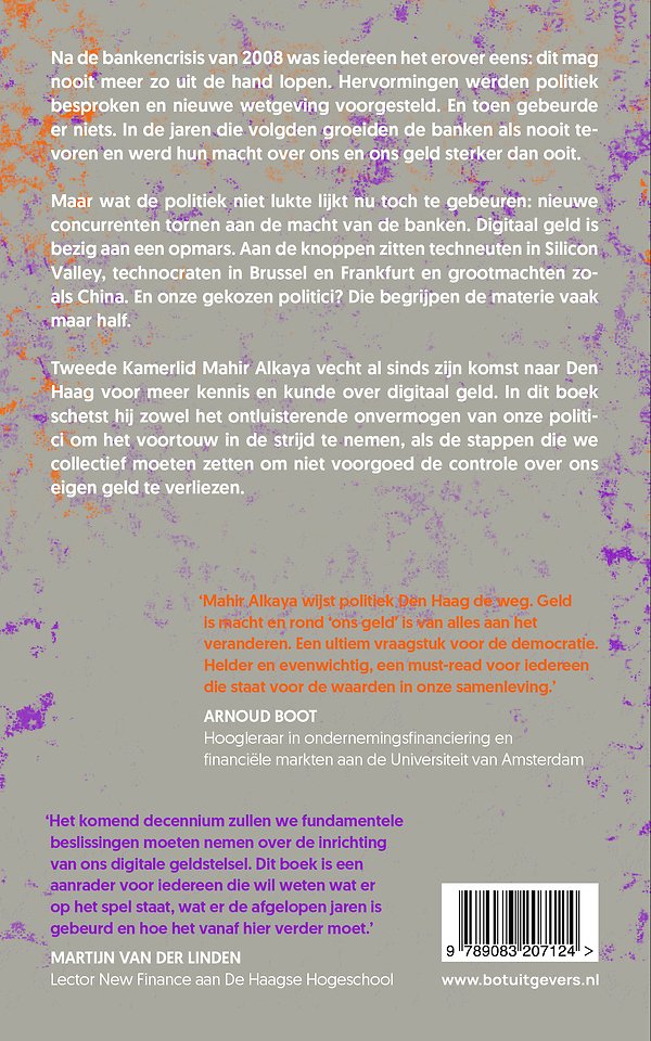 Tweede Kamerlid Mahir Alkaya vecht al sinds zijn komst naar Den Haag voor meer kennis en kunde over digitaal geld. Zijn strijd: niet afwachten totdat ons geld niet langer van onszelf is, maar nu ingrijpen en leiding nemen in de morele en politieke keuzes die de komst digitaal geld van ons vragen. In dit boek schetst hij zowel het ontluisterende onvermogen van onze politici om het voortouw in de strijd te nemen, als de stappen die we collectief moeten zetten om niet voorgoed de controle over ons eigen geld te verliezen.