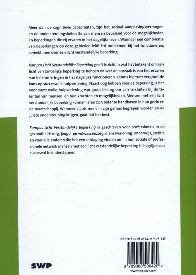Kompas Licht Verstandelijke Beperking is geschreven voor professionals in de gezondheidszorg, jeugd- en volwassenzorg, dienstverlening, onderwijs, justitie en voor alle anderen die het een uitdaging vinden om in hun sociale of professionele netwerk mensen met een licht verstandelijke beperking te begrijpen en succesvol te ondersteunen.