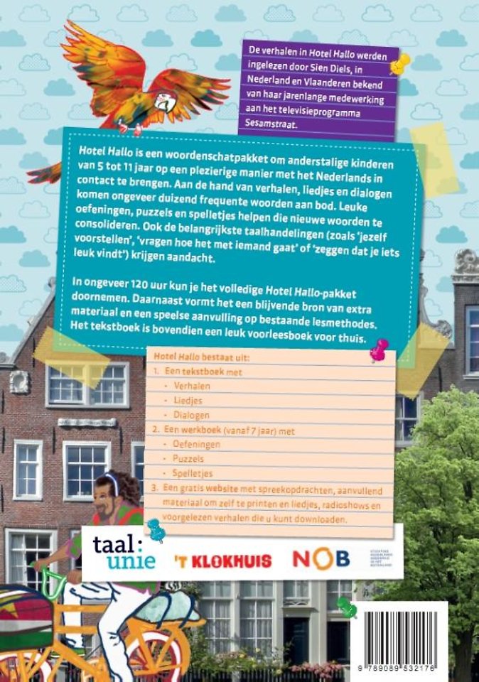 Hotel Hallo is een woordenschatpakket om anderstalige kinderen van 5 tot 11 jaar op een plezierige manier met het Nederlands in contact te brengen. Aan de hand van verhalen, liedjes en dialogen komen ongeveer duizend frequente woorden aan bod. Leuke oefeningen, puzzels en spelletjes helpen die nieuwe woorden te consolideren. Ook de belangrijkste taalhandelingen (zoals 'jezelf voorstellen', 'vragen hoe het met iemand gaat' of 'zeggen dat je iets leuk vindt') krijgen aandacht.