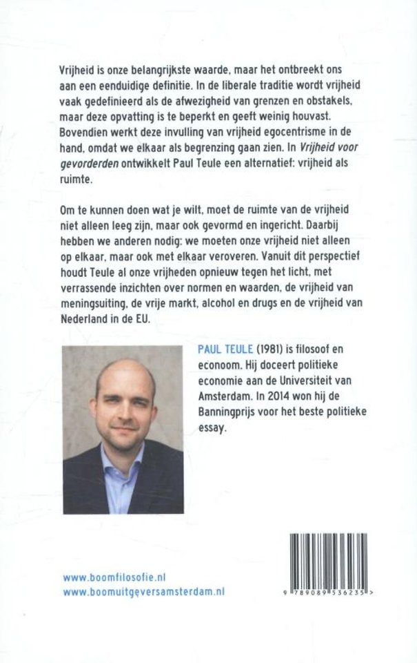 Vrijheid is onze belangrijkste waarde, maar het ontbreekt ons aan een eenduidige definitie. In de liberale traditie wordt vrijheid vaak gedefinieerd als de afwezigheid van grenzen en obstakels, maar deze opvatting is te beperkt en geeft weinig houvast. Bovendien werkt deze invulling van vrijheid egocentrisme in de hand, omdat we elkaar als begrenzing gaan zien. In 'Vrijheid voor gevorderden' ontwikkelt Paul Teule een alternatief: vrijheid als ruimte.