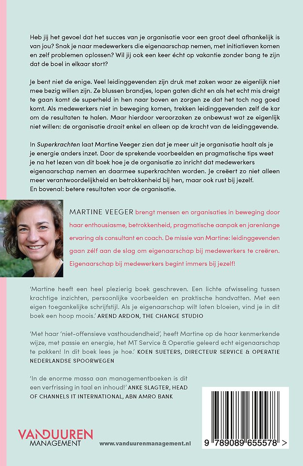 In 'Superkrachten' laat Martine Veeger zien dat je meer uit je organisatie haalt als je je energie anders inzet. Door de sprekende voorbeelden en pragmatische tips weet je na het lezen van dit boek hoe je de organisatie zo inricht dat medewerkers eigenaarschap nemen en daarmee superkrachten worden. Je creëert zo niet alleen meer verantwoordelijkheid en betrokkenheid bij hen, maar ook rust bij jezelf. En bovenal: betere resultaten voor de organisatie.