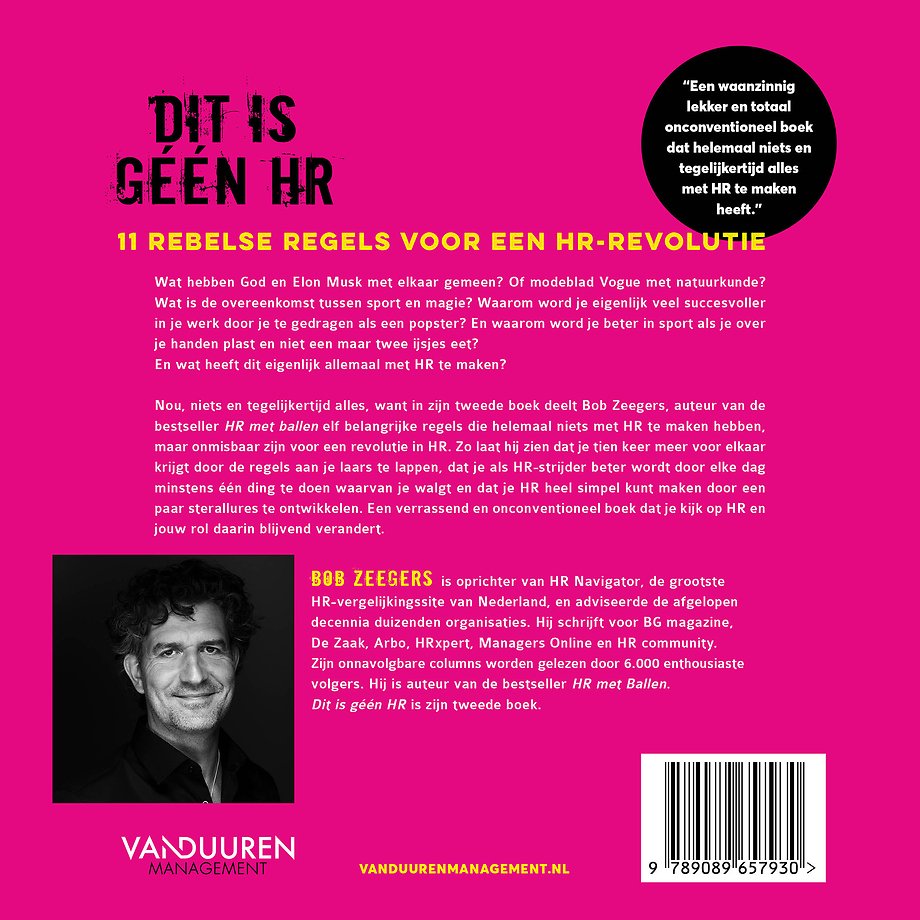 Bob Zeegers is oprichter van HR Navigator, de grootste HR vergelijkingssite van Nederland, en adviseerde de afgelopen decennia duizenden organisaties. Hij schrijft voor BG magazine, De Zaak, Arbo, HRxpert, Managers Online en HR community. Zijn onnavolgbare columns worden gelezen door 6.000 enthousiaste volgers. Bob schreef de bestseller HR met Ballen en is nu terug met Dit is géén HR.