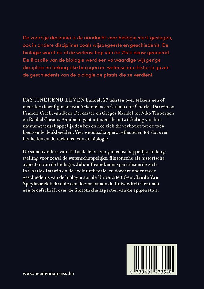 De samenstellers van dit boek delen een gemeenschappelijke belangstelling voor zowel de wetenschappelijke, filosofische als historische aspecten van de biologie. Lien Van Speybroeck behaalde een doctoraat aan de Universiteit Gent met een proefschrift over de filosofische aspecten van de epigenetica. Johan Braeckman specialiseerde zich in Charles Darwin en de evolutietheorie, en doceert onder meer geschiedenis van de biologie aan de Universiteit Gent.