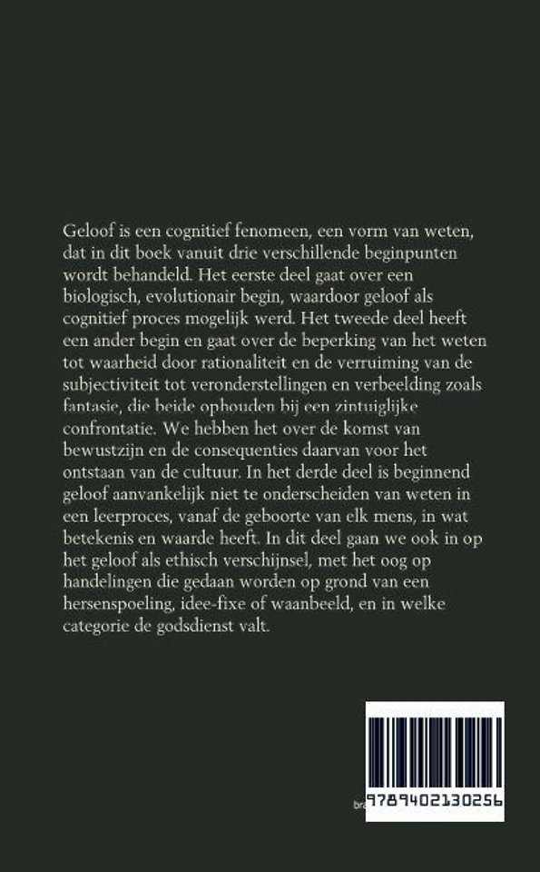 Geloof is een cognitief fenomeen, een vorm van weten, dat in dit boek vanuit drie verschillende beginpunten wordt behandeld. Het eerste deel gaat over een biologisch, evolutionair begin, waardoor geloof als cognitief proces mogelijk werd. Het tweede deel heeft een ander begin en gaat over de beperking van het weten tot waarheid door rationaliteit en de verruiming van de subjectiviteit tot veronderstellingen en verbeelding zoals fantasie, die beide ophouden bij een zintuiglijke confrontatie. We hebben het over de komst van bewustzijn en de consequenties daarvan voor het ontstaan van de cultuur. In het derde deel is beginnend geloof aanvankelijk niet te onderscheiden van weten in een leerproces, vanaf de geboorte van elk mens, in wat betekenis en waarde heeft. In dit deel gaan we ook in op het geloof als ethisch verschijnsel, met het oog op handelingen die gedaan worden op grond van een hersenspoeling, idee-fixe of waanbeeld, en in welke categorie de godsdienst valt.