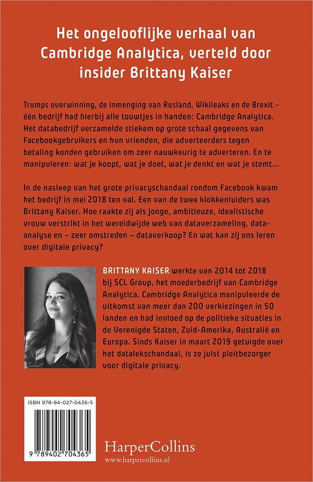 Brittany Kaiser was onderdeel van de dataroof van Cambridge Analytica. Nu is ze klokkenluider en gaat ze de strijd aan voor digitale privacy. Recent is op Netflix de documentaire The Great Hack verschenen. Dit boek, geschreven door een insider, volgt in oktober.