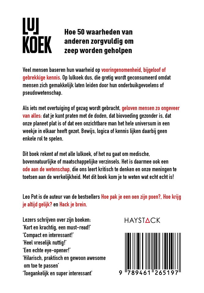 Dit boek rekent af met alle lulkoek, of het nu gaat om medische, bovennatuurlijke of maatschappelijke verzinsels. Het is daarmee ook een ode aan de wetenschap, die ons leert kritisch te denken en onze meningen te toetsen aan de werkelijkheid. Met dit boek kom je te weten wat echt echt is!