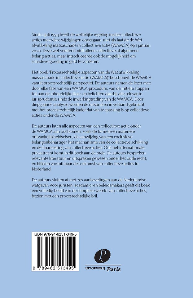 Het boek ‘Procesrechtelijke aspecten van de Wet afwikkeling massaschade in collectieve actie (WAMCA)’ beschouwt de WAMCA vanuit procesrechtelijk perspectief. De auteurs nemen de lezer mee door elke fase van een WAMCA-procedure, van de initiële stappen tot aan de inhoudelijke fase, en belichten daarbij alle relevante jurisprudentie sinds de inwerkingtreding van de WAMCA. Door diepgaande analyses worden de uitspraken in verband gebracht met het procesrechtelijk kader dat van toepassing is op collectieve acties onder de WAMCA.