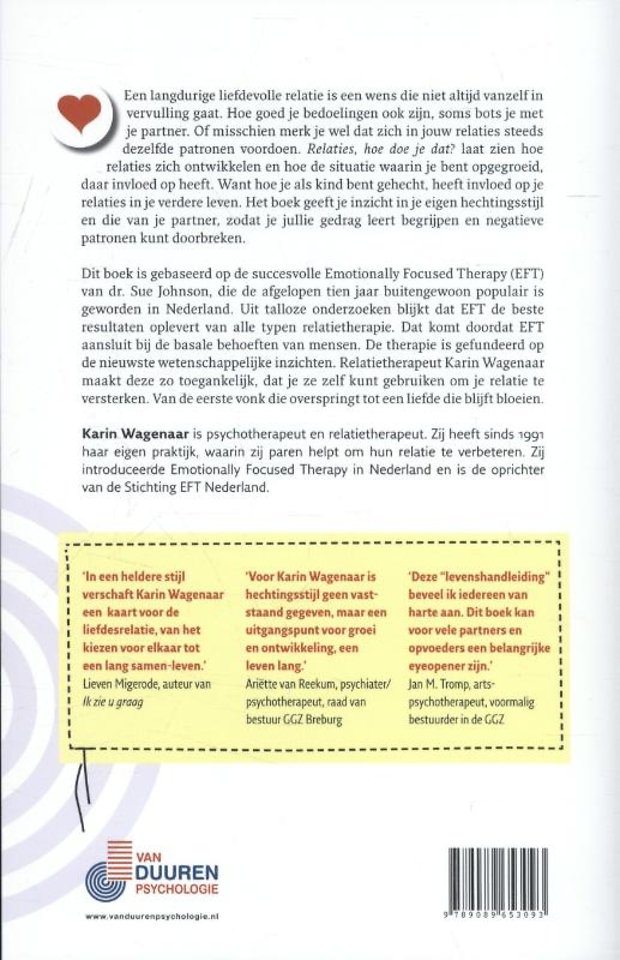 Dit boek is gebaseerd op de succesvolle Emotionally Focused Therapy (EFT), een methode die emoties gebruikt als ingang voor verandering. Uit talloze onderzoeken blijkt dat EFT de beste resultaten oplevert van alle typen relatietherapie. EFT is gefundeerd op de nieuwste wetenschappelijke inzichten in de manier waarop volwassenen relaties vormen. Relatietherapeut Karin Wagenaar maakt deze wetenschappelijke inzichten zo toegankelijk, dat je ze zelf kunt gebruiken om je relatie te versterken. Van de eerste vonk die overspringt tot een liefde die blijft bloeien.