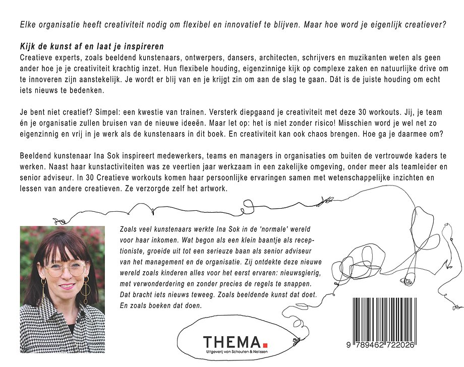 Beeldend kunstenaar Ina Sok inspireert medewerkers, teams en managers in organisaties om buiten de vertrouwde kaders te werken. Naast haar kunstactiviteiten was ze veertien jaar werkzaam in een zakelijke omgeving, onder meer als teamleider en senior adviseur. In 30 Creatieve workouts komen haar persoonlijke ervaringen samen met wetenschappelijke inzichten en lessen van andere creatieven. Ze verzorgde zelf het artwork.
