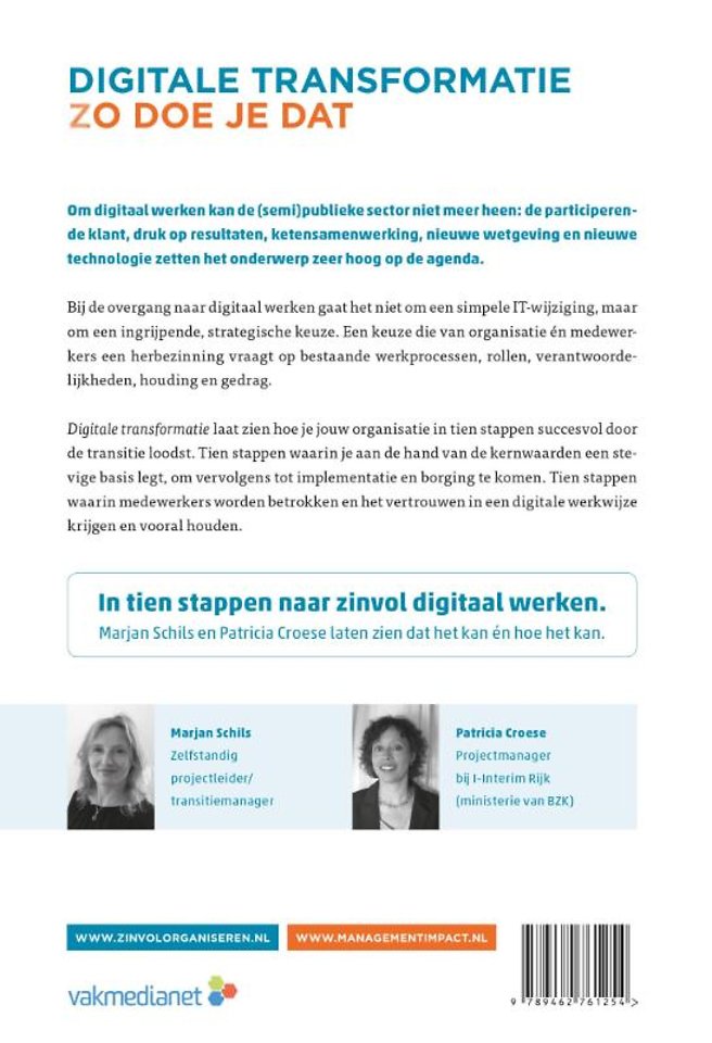 Digitale transformatie laat zien hoe je jouw organisatie in tien stappen succesvol door de transitie loodst. Tien stappen waarin je aan de hand van de kernwaarden een stevige basis legt, om vervolgens tot implementatie en borging te komen. Tien stappen waarin medewerkers worden betrokken en het vertrouwen in een digitale werkwijze krijgen en vooral houden.