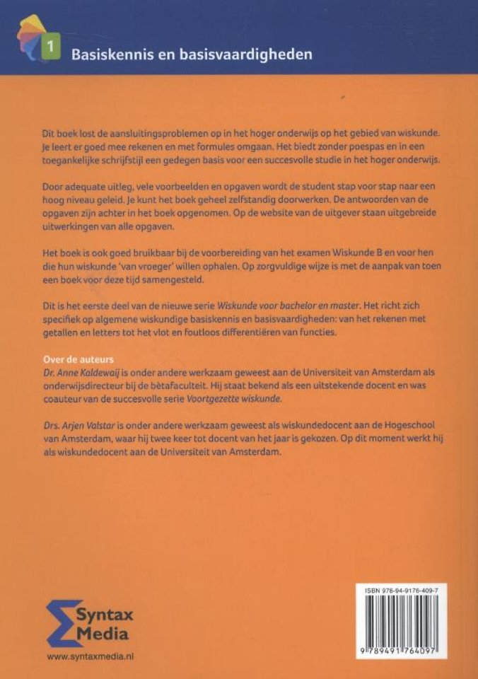 Dit boek lost de aansluitingsproblemen op in het hoger onderwijs op het gebied van wiskunde. Je leert er goed mee rekenen en met formules omgaan. Het biedt zonder poespas en in een toegankelijke schrijfstijl een gedegen basis voor een succesvolle studie in het hoger onderwijs. Door adequate uitleg, vele voorbeelden en opgaven wordt de student stap voor stap naar een hoog niveau geleid. Je kunt het boek geheel zelfstandig doorwerken. De antwoorden van de opgaven zijn achter in het boek opgenomen. Op de website van de uitgever staan uitgebreide uitwerkingen van alle opgaven. Het boek is ook goed bruikbaar bij de voorbereiding van het examen Wiskunde B en voor hen die hun wiskunde 'van vroeger' willen ophalen. Op zorgvuldige wijze is met de aanpak van toen een boek voor deze tijd samengesteld.Dit is het eerste deel van de nieuwe serie Wiskunde voor bachelor en master. Het richt zich specifiek op algemene wiskundige basiskennis en basisvaardigheden: van het rekenen met getallen en letters tot het vlot en foutloos differentiëren van functies.