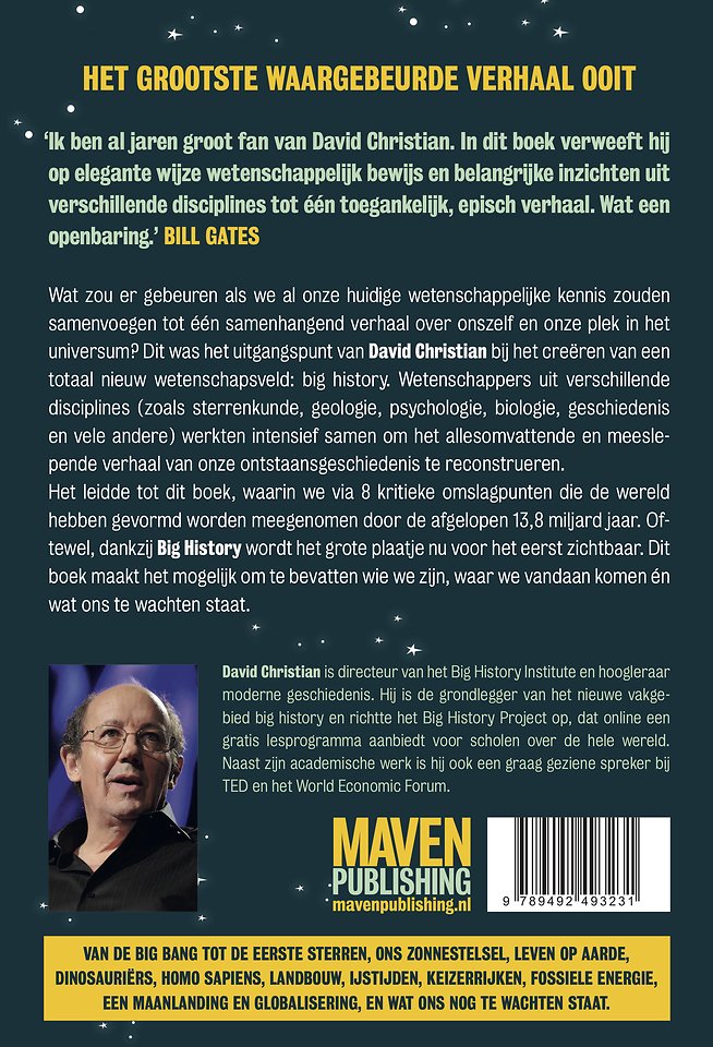In zijn boek neemt Christian ons aan de hand van acht omslagpunten mee door de afgelopen 13,8 miljard jaar. Hij beschrijft hoe je verschillende thematische paden door de geschiedenis kunt volgen, die je leiden van de oerknal tot het ontstaan van leven en van de opkomst van de mens tot ver in de toekomst. Big history maakt het mogelijk om te bevatten wie we zijn, waar we vandaan komen én wat ons te wachten staat.