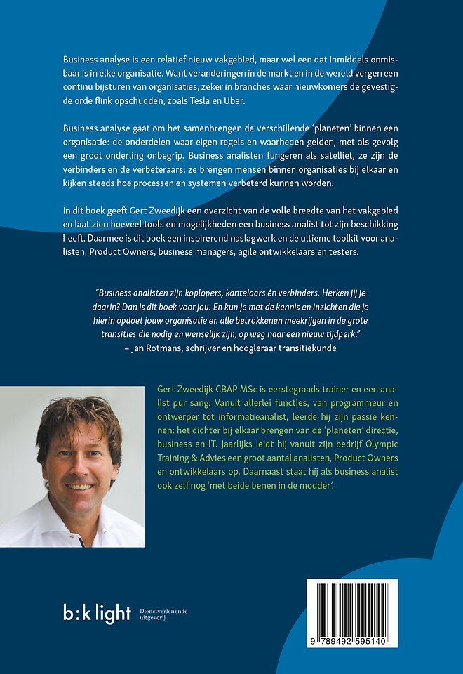 In dit boek geeft Gert Zweedijk een overzicht van de volle breedte van het vakgebied en laat zien hoeveel tools en mogelijkheden een business analist tot zijn beschikking heeft. Daarmee is dit boek een inspirerend naslagwerk en de ultieme toolkit voor analisten, Product Owners, business managers, agile ontwikkelaars en testers.