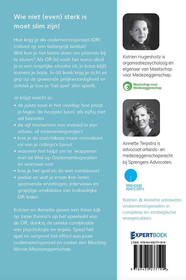Katrien en Annette geven een frisse kijk op taaie thema’s op het speelveld van de OR, dankzij de unieke combinatie van psychologie en wet. Speel het spel en vergroot het effect van jouw ondernemingsraad en creëer een machtig mooie medezeggenschap.