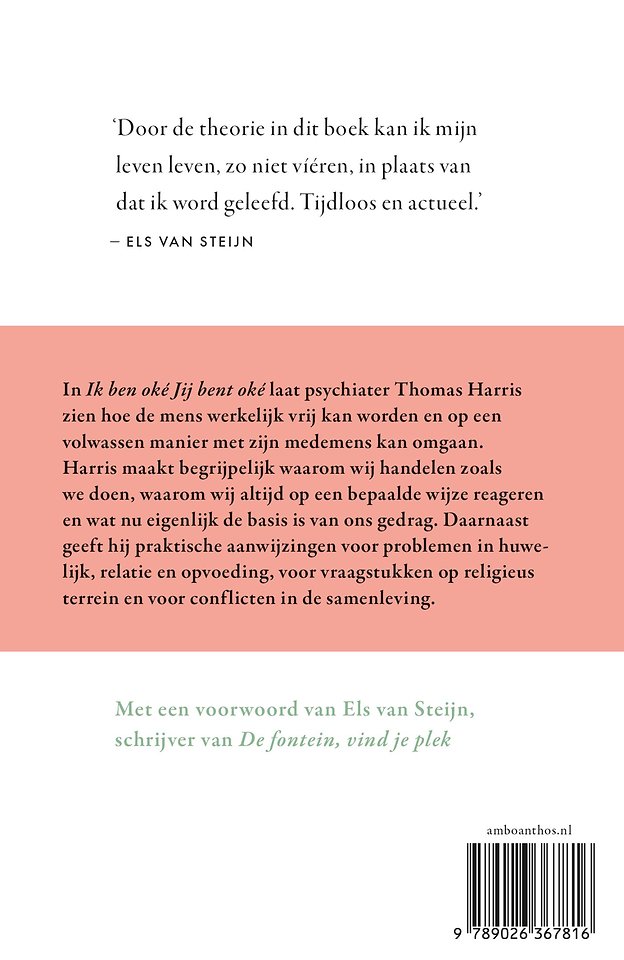 Dit boek laat je zien hoe de mens werkelijk vrij kan worden en op volwassen manier met zijn medemens kan omgaan. Harris maakt begrijpelijk waarom wij handelen zoals we doen, waarom wij altijd op een bepaalde wijze reageren en wat nu eigenlijk de basis is van ons gedrag. Daarnaast geeft hij praktische aanwijzingen voor problemen in huwelijk, relatie en opvoeding, voor vraagstukken op religieus terrein en voor conflicten in de samenleving. Met een voorwoord van Els van Steijn schrijver van De fontein, vind je plek.