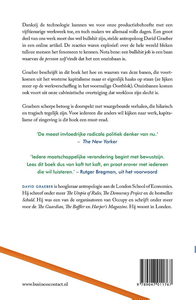Meer over David GraeberIn ‘Bullshit jobs’ stelt antropoloog en invloedrijk denker David Graeber dat een groot deel van ons werk zinloos moet zijn. Want dankzij de technologie kunnen we voor onze productiebehoefte met een vijftienurige werkweek toe, en toch maken we allemaal nog steeds volle dagen. Hij kreeg op een blog hierover duizenden reacties: over de hele wereld blijken veel mensen het fenomeen te kennen. Nota bene: een bullshit job is een baan waarvan de persoon zelf vindt dat het (deels) een onzinbaan is.
