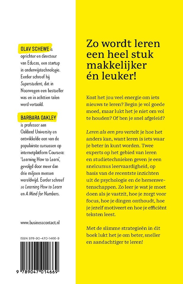 Meer over de auteursIn ‘Leren als een pro’ vertellen Olav Schewe en Barbara Oakley hoe je beter kunt worden in leren. Want kost het jou veel energie om iets nieuws te leren? Begin je vaak vol goede moed, maar lukt het je niet om vol te houden? Of ben je snel afgeleid? ‘Leren als een pro’ vertelt je hoe het anders kan.