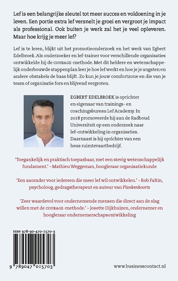 Lef is te leren, blijkt uit het promotieonderzoek en het werk van Egbert Edelbroek. Als onderzoeker en lef-trainer voor verschillende organisaties ontwikkelde hij de courage-methode. Met dit heldere en wetenschappelijk onderbouwde stappenplan leer je hoe lef werkt en hoe je je angsten en andere obstakels de baas blijft. Zo kun je jouw comfortzone en die van je team of organisatie fors en blijvend vergroten.