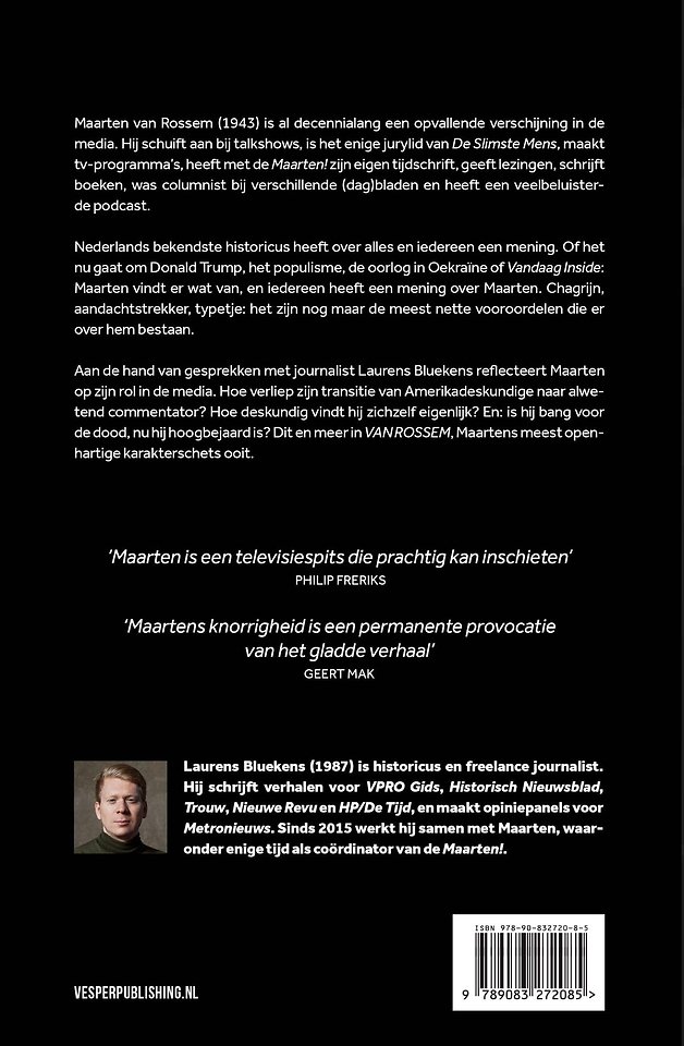Maarten van Rossem (1943) is al decennialang een opvallende verschijning in de media. Hij schuift aan bij talkshows, is het enige jurylid van De Slimste Mens, maakt tv-programma’s, heeft met de Maarten! zijn eigen tijdschrift, geeft lezingen, schrijft boeken, was columnist bij verschillende (dag)bladen en heeft een veelbeluisterde podcast.