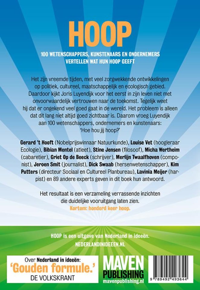 Meer over Joris Luyendijk'HOOP' is de vijfde editie in de succesvolle reeks 'Nederland in ideeën'. In deze reeks geven toonaangevende wetenschappers, ondernemers en kunstenaars antwoord op een vraag op het raakvlak van wetenschap en maatschappij. Na Paulien Cornelisse, Viktor&Rolf en Anton Corbijn stelt dit jaar niemand minder dan Joris Luyendijk de vraag. En wel: 'Hoe hou je hoop?'