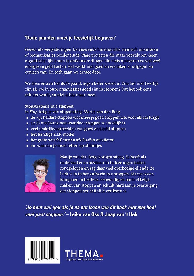 In Stop. krijg je van stopstrateeg Marije van den Berg de vijf heldere stappen waarmee je goed stoppen in jouw team of organisatie wel voor elkaar krijgt. Je krijgt dat extra inzicht om nu toch echt definitief de knoop door te hakken en te stoppen. Mét of zonder feest.